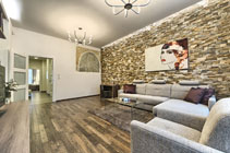A spacious living area designed in petrol blue tones has large windows filling the space with natural light. It offers a satellite smart TV, comfortable armchairs and a small dining table. A fully equipped kitchenette will let you exercise your culinary flare. In a bedroom you will be impressed by a high king size bed which guarantees a relaxing night's sleep. A bathroom is shiny and modern, fitted with a bathtub, you can also use an extra toilet. Wardrobes provide enough storage space for all your luggage and clothing. Business travelers will appreciate a stylish work desk or Wi-Fi internet connection. All major sights can be easily reached on foot, the Old Town Square or the Charles Bridge is just 5 minutes' walk from the apartment.